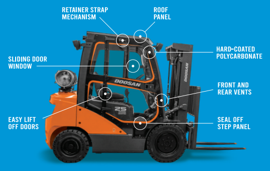 Doosan opět přišel s elegantním designem a vynikajícím výkonem lehké polykarbonátové sportovní kabiny. Tato kabina navržená výhradně pro vysokozdvižné vozíky Doosan Heart-of-the-Line naplňuje všechny požadavky. Mezi vlastnosti patří vylepšené větrání umožňující řidiči maximální proudění vzduchu v kabině. Kabina, navržená speciálně pro snadné odnímání prvků, bude vyhovovat vašim potřebám, ať jsou sezónní nebo celoroční.